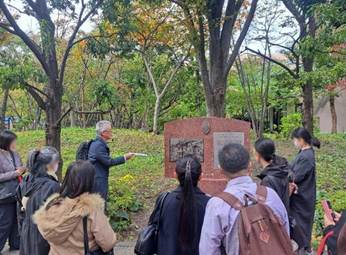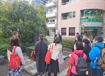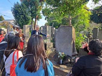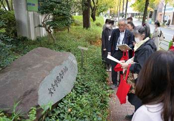 本学名誉教授の原聖先生から創立125周年を迎えた女子美の歴史の解説をいただきながら、創立者の一人「横井玉子」ゆかりの地「築地・谷中」や、明治・大正時代の校舎跡地である「本郷」などを巡りました。